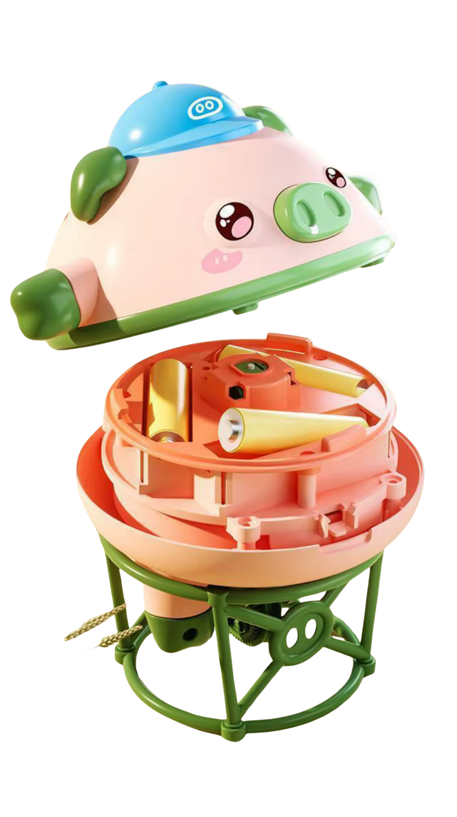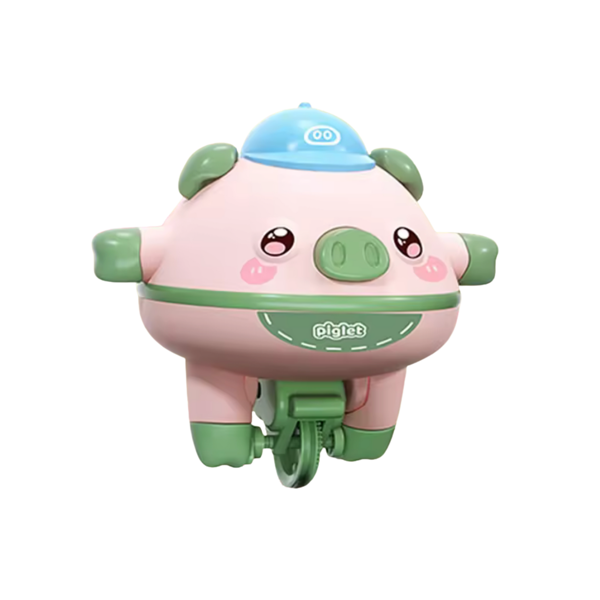 Zabawka ma wymienne akcesoria i może działać jako jednokołowiec lub wirujący żyroskop. Wbudowany mechanizm utrzymuje stabilność, dzięki czemu świnka porusza się płynnie i zaskakująco pewnie.